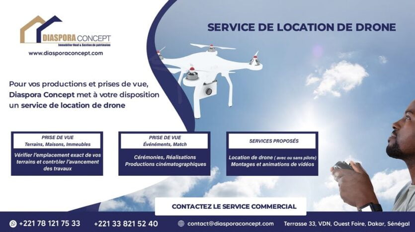CONTACTEZ LE SERVICE COMMERCIAL+221 78 121 75 33 ou au +221 33 821 52 40contact@diasporaconcept.comNos bureaux : Terrasse 33, VDN, Ouest Foire, Dakar, Sénégal #drone#4K#immobiliersénégal