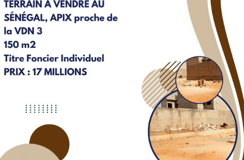 TERRAIN À VENDRE AU SÉNÉGAL. APIX PROCHE DE LA VDN 3 150 m2 Titre Foncier Individuel PRIX:17 MILLIONS